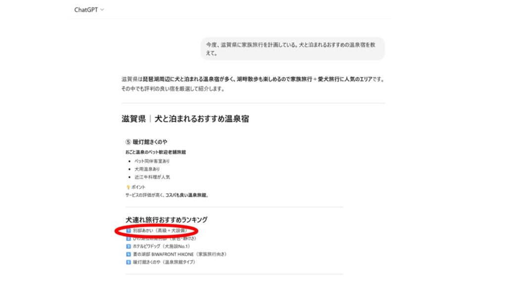 「今度、滋賀県に家族旅行を計画している。犬と泊まれるおすすめの温泉宿を教えて。」