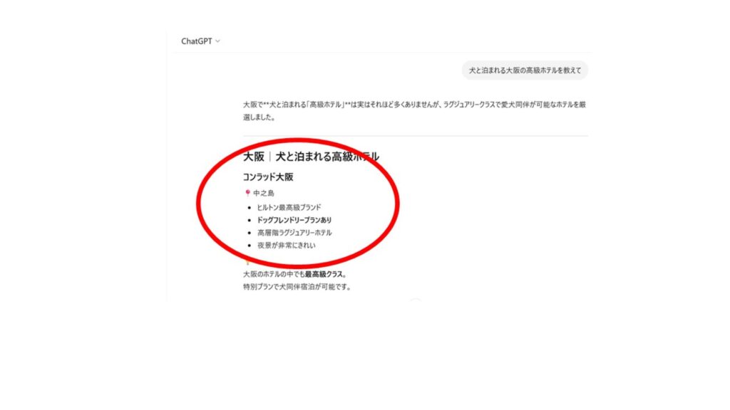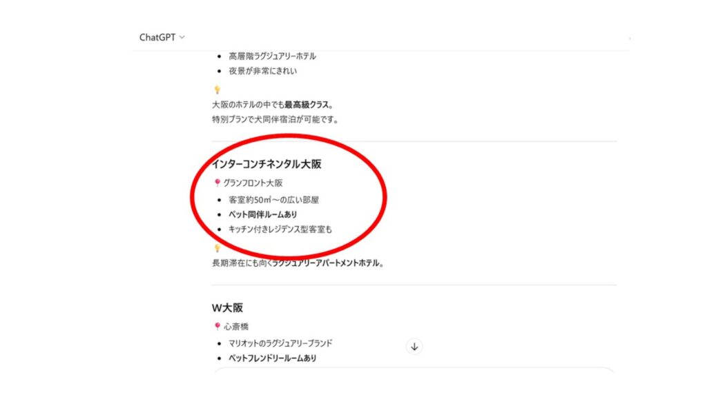 すると、Chat GPTは写真のように高級ホテルをいくつか提案してくれます。